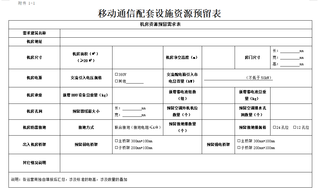 运营商提交配套建设需求时,需明确新增的信源设备及天线的物理参数(数量、重量、尺寸等),由轮值单位汇总需求后提交至建设单位,由建设单位回复是否满足建筑物承重要求。