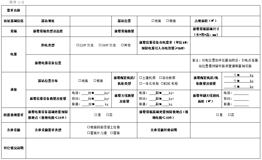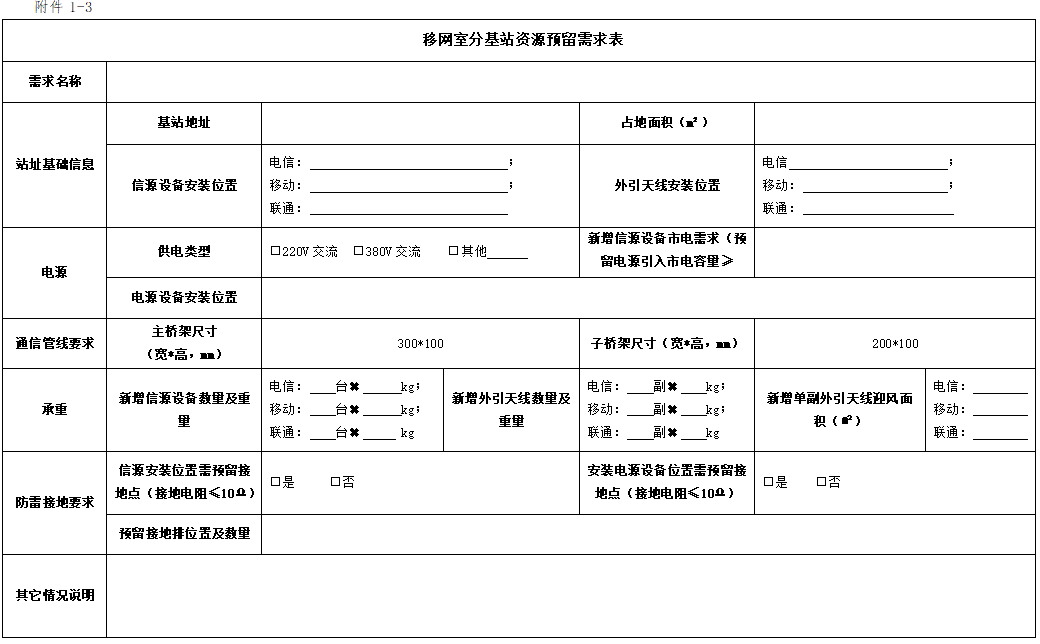 5.准备资料文件:室外基站资源预留设计方案图纸、移网室外基站资源预留需求表(附件1-2)。资源预留方案需体现预留基站塔桅及配套电源设备的建设位置,需体现基站占用面积,资源预留表按需填报。